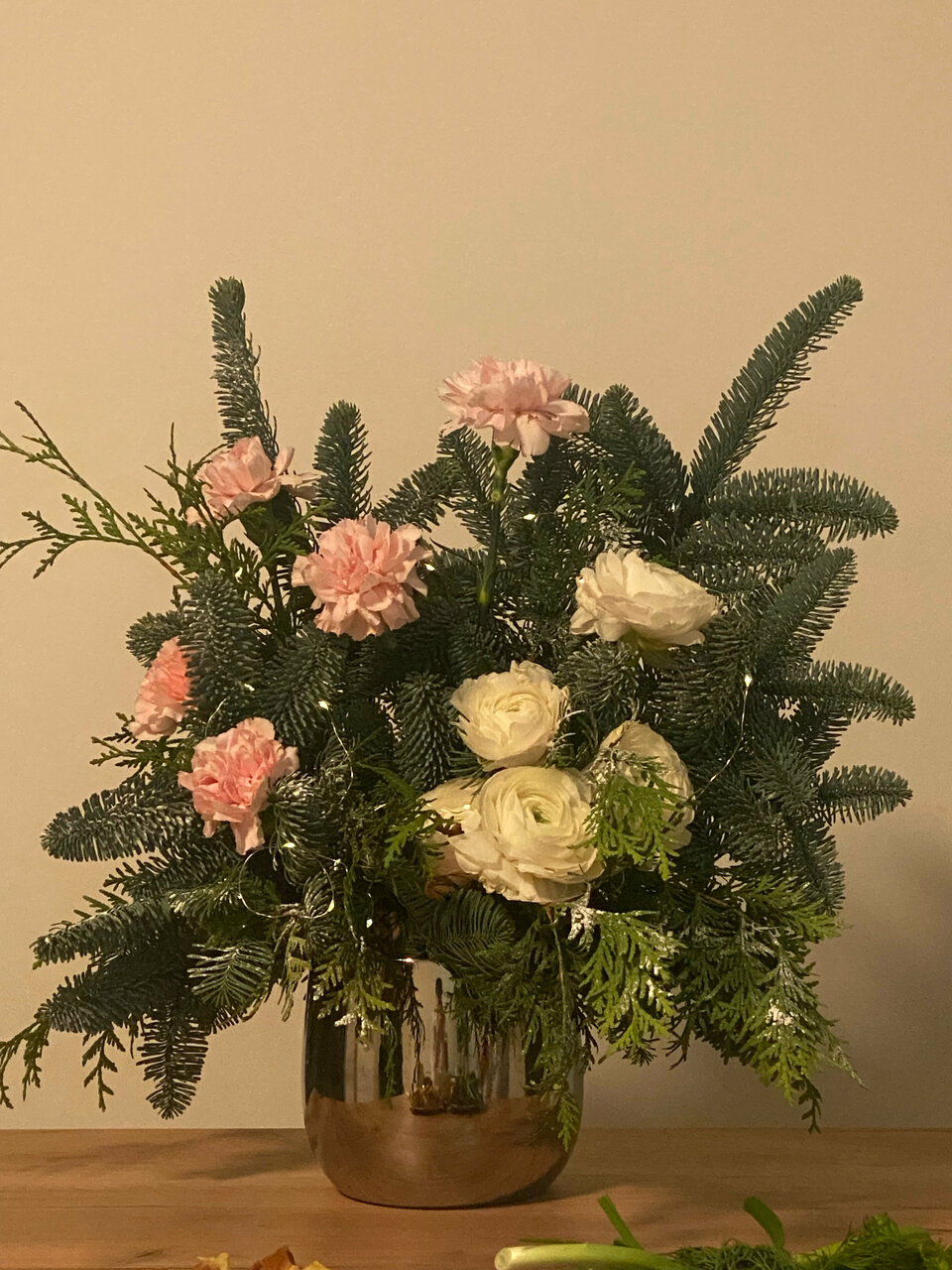 Результат превзошел все ожидания! Все просто прекрасно: композиция сбалансированная и гармоничная, цветы свежайшие, елочка очень аккуратная, а теплый свет гирлянды добавил магии. Для мамы это стало настоящим сюрпризом и украшением всего праздника. Она безумно рада, постоянно фотографирует свой подарок и хвалит.